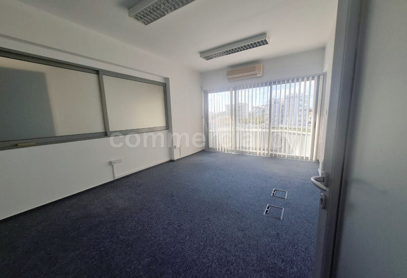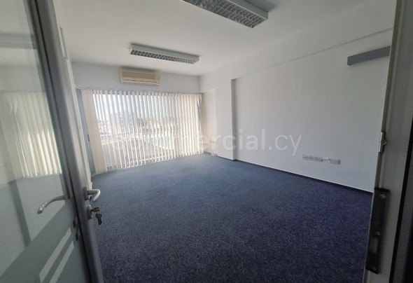 Office for Rent in Larnaca Center. The property has an area of 97 sq m and comprises of a reception area, an open plan workspace, four offices, covered veranda with an area of 5 sq m. Also has a separate small kitchen and two w/c in total. The office offers one parking spaces on the ground floor and public space parking behind of the building.